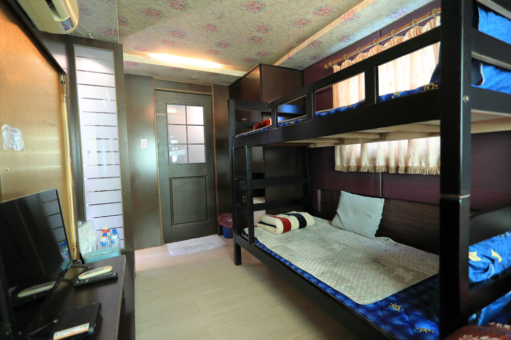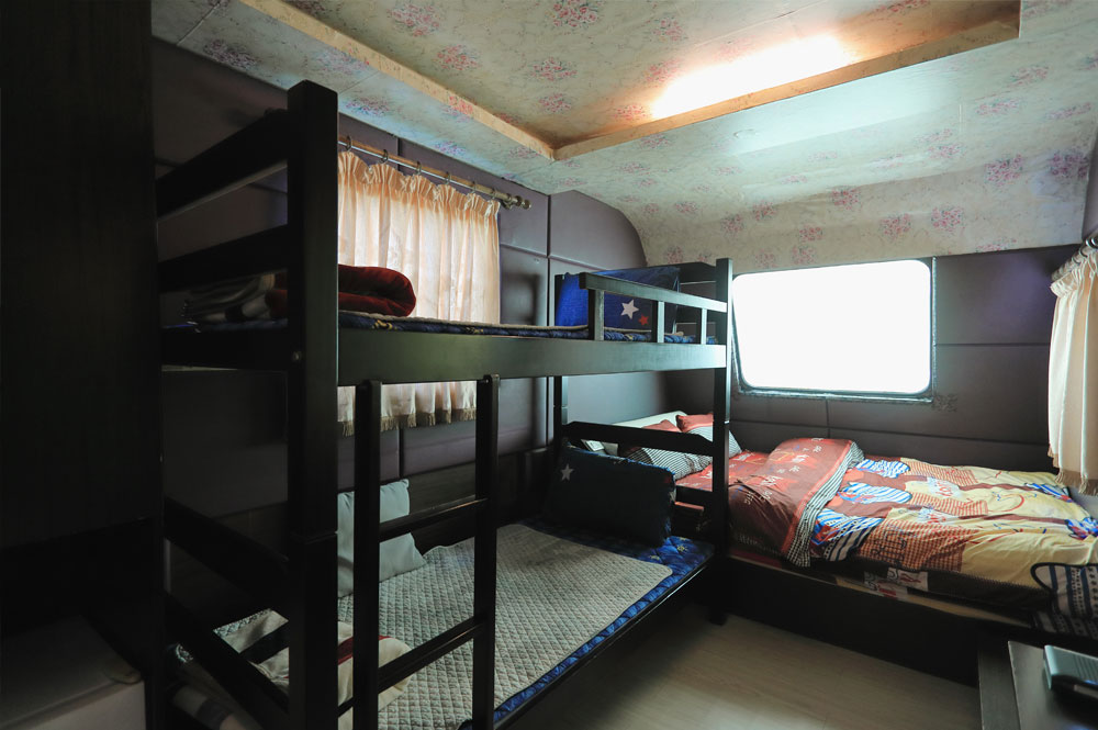 - 車內標準雙人床一張及單人上下舖(含雙人被一床床,單人被2床,及枕頭4顆)、分離式冷氣、液晶電視、電熱快煮壺、單門小冰箱、三孔110V插座