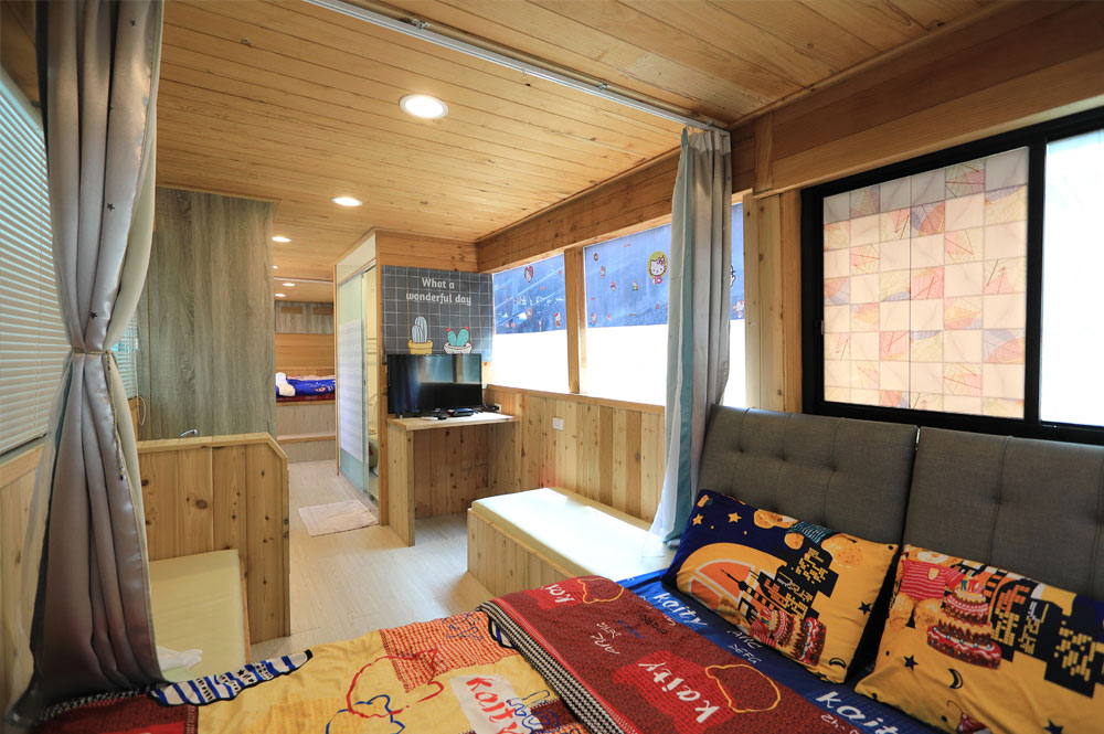 - 4人通舖彈簧床300*300公分(2床雙人棉被及4個枕頭)、雙人彈簧床5*6尺(1床雙人棉被及2個枕頭)、分離式冷氣*2、液晶電視、快煮壺、單門小冰箱、置物櫃、110V插座